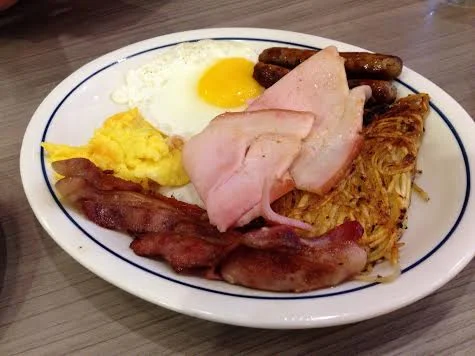 My wife’s Breakfast Sampler Plate, meanwhile, had two eggs, two bacon strips, two pork sausages, two pieces of ham, hash browns, and two pieces of Buttermilk pancakes.